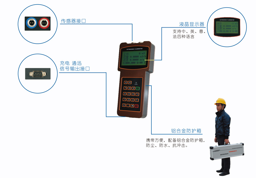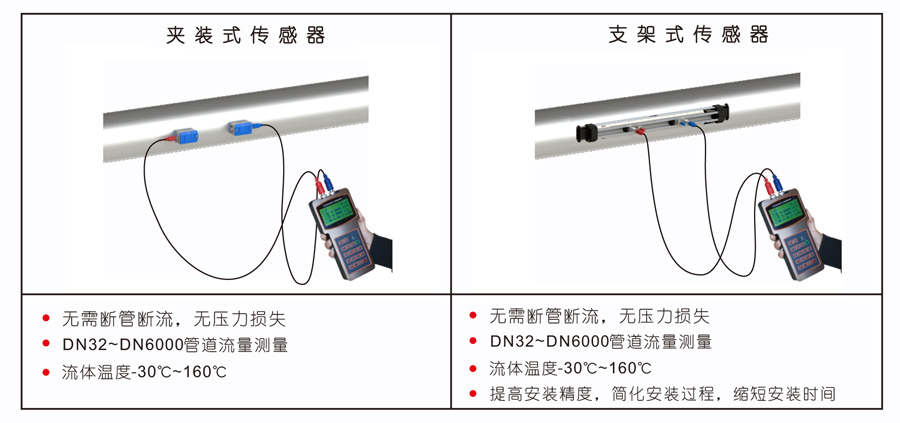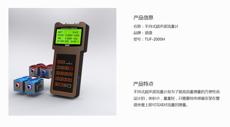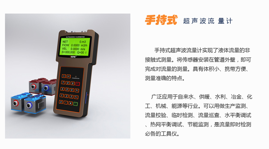 手持式超聲波流量計(jì)實(shí)現(xiàn)了液體流量的非接觸式測(cè)量。將傳感器安裝在管道外壁,即可完成對(duì)流量的測(cè)量。具有體積小、攜帶方便、測(cè)量準(zhǔn)確等特點(diǎn)。